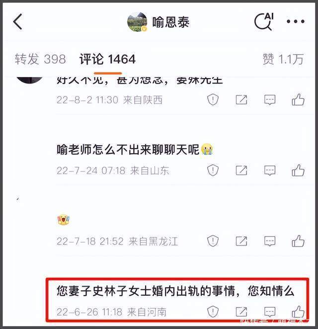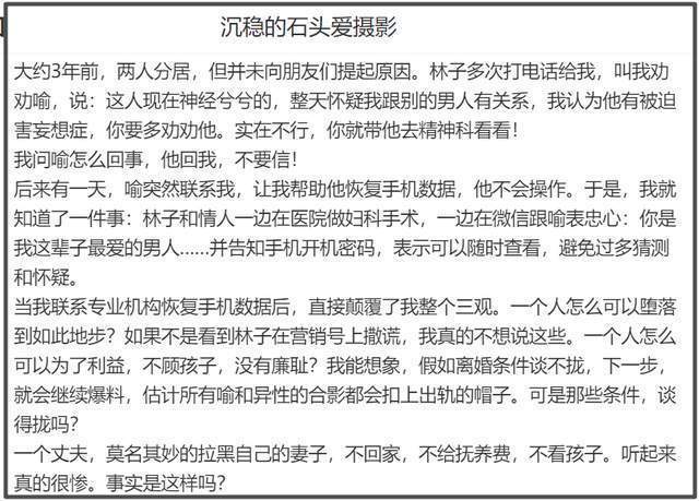 从好友的博文能看出来,喻恩泰和老婆分居闹婚变,史林子“恶人先告状”,找到石头想调解夫妻关系。还怀疑喻恩泰有被害妄想症,整天怀疑老婆和别人有关系,让朋友带他去精神科,而喻恩泰则回复石头,让他别信史林子。